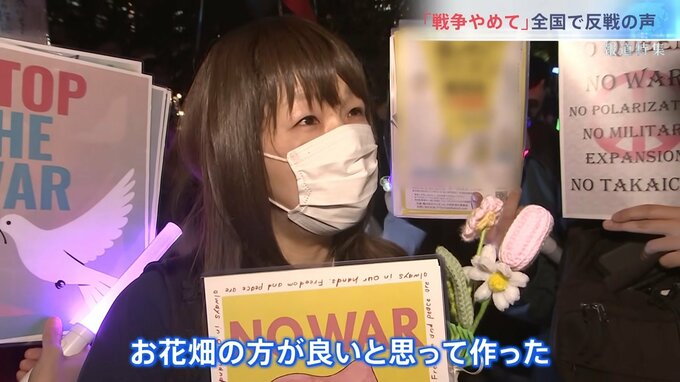 「全然、全く来たことがなくて。自分がデモに行くとは思ってもいなかった。(Q.造花は自分で作った?)はい。戦争反対と言うと『お花畑』とSNSで言われるが、お花畑の方が良いと思って作った」