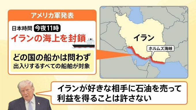 アメリカ中央軍は、日本時間13日午後11時から、イランの海上を封鎖すると発表しました。どの国の船かは問わず、イランの港を出入りするすべての船舶が対象となります。