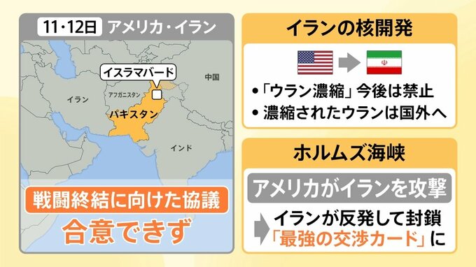 11日・12日に行われたアメリカとイランの協議は、大きく2つの問題で合意できなかったとされています。1つは「イランの核開発」、もう1つは「ホルムズ海峡」についてです。