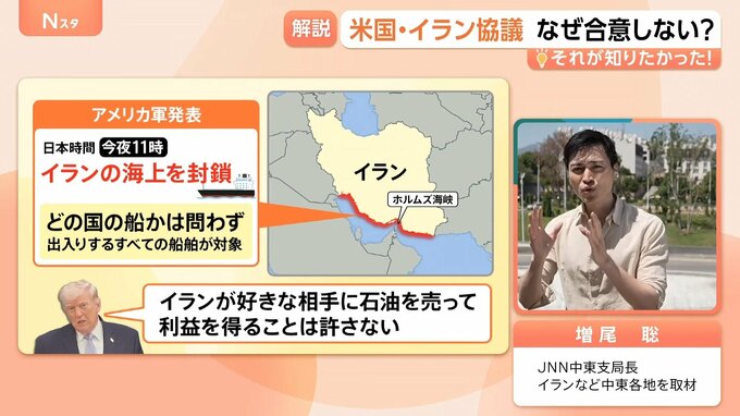 アメリカが行おうとしているイランの海上封鎖について補足すると、アメリカはあくまで「イランの港を通過する船に対して制限をとる」としていて、「ホルムズ海峡を通行しようとする船に対しては妨げない」と言っています。