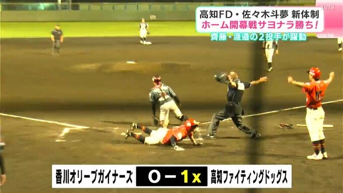 3球目を右中間へ打ち上げライトが捕球。やや浅いフライでしたが補球と同時に3塁ランナー三井佑真がスタートし生還しました。犠牲フライとなり、ファイティングドッグスはホーム開幕戦でサヨナラ勝ち。2連勝としました。