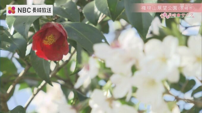 園内には桜だけでなく、鮮やかな赤いツバキも咲き誇り、てんとう虫が花びらの上を歩くのどかな光景も広がっていました。
