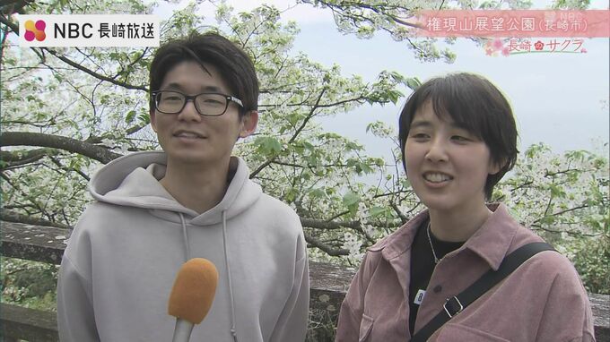 「今年はいつもと違うところに行こうと思ってここに来ました。海と一緒に桜を見られるところはあまりないので、すごく綺麗で良かったです」