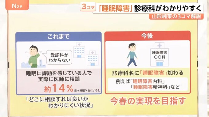 正しい医療機関を受診してもらうために、今後は「睡眠障害内科」「睡眠障害精神科」など、診療科名に「睡眠障害」が加わります。