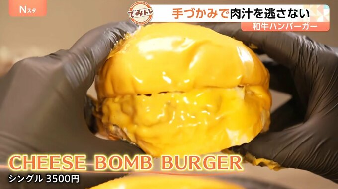 実は「手袋を着けて食べてもらおう」とお店が考えた「きっかけ」となったのが、名物メニュー「CHEESE BOMB BURGER シングル 3500円」です。ハンバーガーがチーズまみれに。手で豪快に掴んでいただきます。
