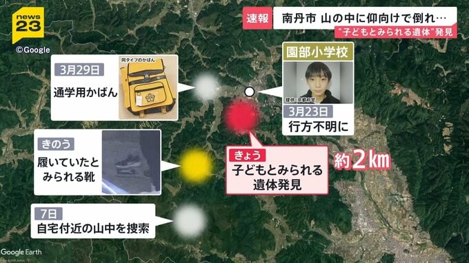 子どもとみられる遺体が見つかったのは、安達さんの行方がわからなくなった園部小学校から約2キロ離れた山の中。周辺住民によると、きょう夕方に突然、パトカーなどの車両が多く集まり始めたといいます。