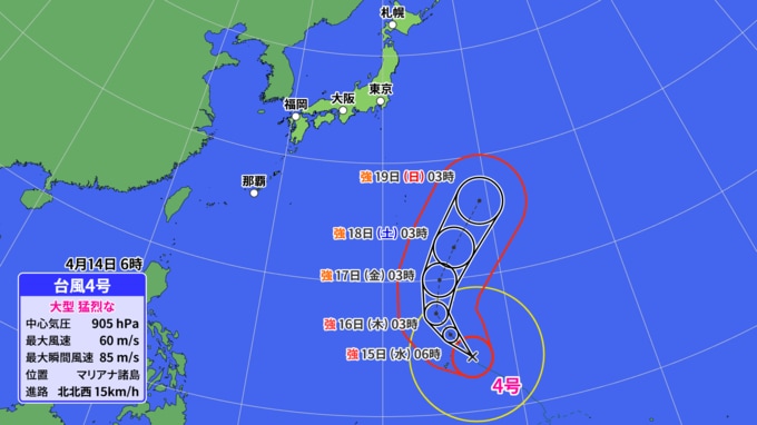 気象庁によりますと、大型で猛烈な台風4号は、14日6時にはマリアナ諸島にあって、1時間に15キロメートルの速さで北北西に進んでいます。中心の気圧は905ヘクトパスカル、中心付近の最大風速は60メートル、最大瞬間風速は85メートルです。
