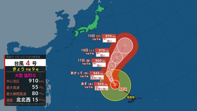 台風4号が、10日に発生しました。14日午前9時現在、大型で猛烈な強さで、マリアナ諸島を時速15kmの速さで北北西へ進んでいます。17日には、「強い」勢力で小笠原近海に進む見込みです。今後の気象庁から発表される最新情報を確認するようにしてください。