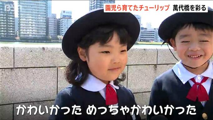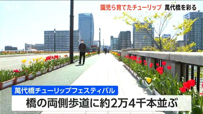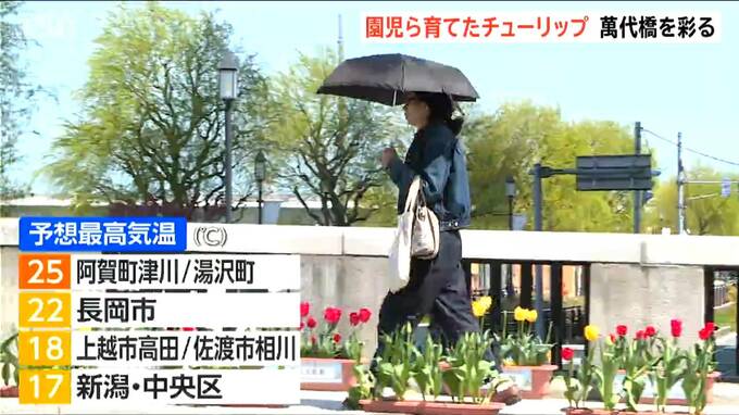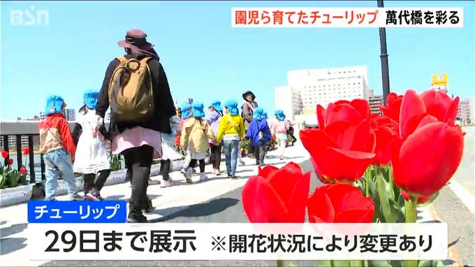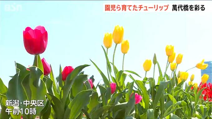 春の訪れを告げるチューリップで新潟市の萬代橋を彩るイベントが14日始まり、園児たちが色とりどりの花を楽しみました。