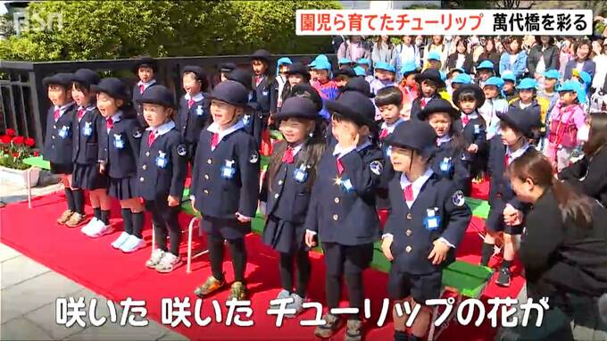 オープニングセレモニーでは花を育てた園児らが消防音楽隊の演奏とともに橋を歩いてチューリップを楽しみました。