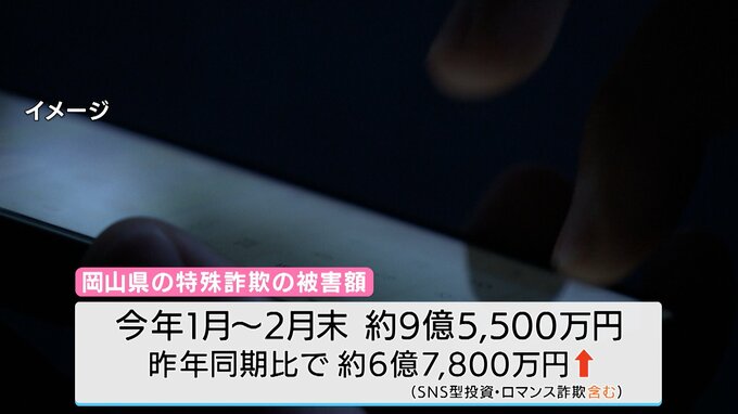 今年に入っても被害に歯止めがかからない特殊詐欺です。2月末時点の岡山県の被害額は約9億5,500万円で、去年の同じ時期と比べて約6億7,800万円の激増。手口としては、SNS型投資詐欺が最多で、被害額は約5億7,720万円となっています。