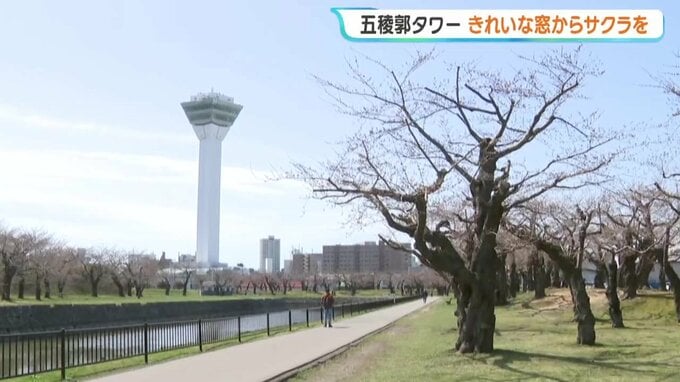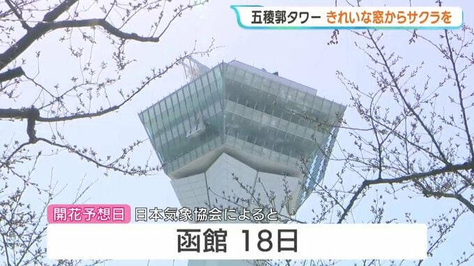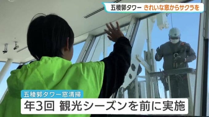 桜の時期を前に、北海道函館市の五稜郭タワーでは、展望台の窓ガラスの清掃作業が行われました。