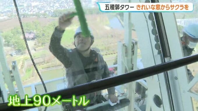 一方、五稜郭タワーでは、地上90メートルの高さでゴンドラに乗った清掃員が315枚もの窓ガラスの清掃作業をしています。