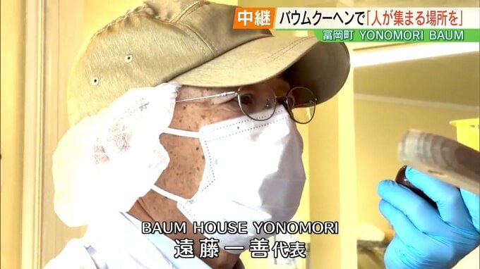 一層一層丁寧にバウムクーヘンを焼き上げているのは、代表の遠藤一善さんです。富岡町で生まれ育った遠藤さんは、一級建築士として故郷の街づくりに貢献してきました。しかし、震災と原発事故で、富岡町は全町避難を余儀なくされました。