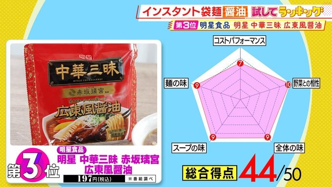 第3位は、明星食品の『明星 中華三昧 赤坂璃宮 広東風醤油』(税込197円 ※番組調べ)。