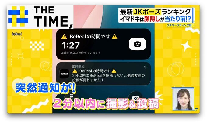 取材したJKほぼ全員が使っていたアプリ『BeReal. 』。アプリから通知が届いたら「2分以内に写真を撮影して投稿しないといけない」というSNSです。