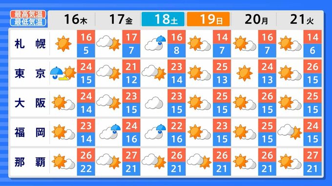 気象庁が14日に発表した週間天気予報によりますと、4月15日から21日にかけては、西日本や沖縄・奄美で雲が広がりやすく、雨の降る日がある見込みです。北日本では、週末と週明けに雨や雪の降る所があるでしょう。