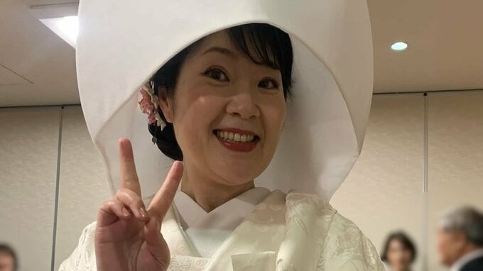 宮川たまこさんは、「4月9日は宮川大助花子師匠の金婚式 そして、大助花子師匠の愛娘の宮川さゆみ姉さんの式 京都の上賀茂神社へお祝いに行ってきました」と報告。白無垢に綿帽子を合わせたさゆみさんが、カメラに向かって笑顔でピースサインをする写真を投稿しました。