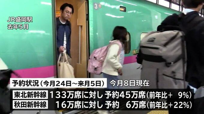 JR東日本によりますと24日から5月5日までのゴールデンウィーク期間中、東北新幹線の指定席は予約可能な133万席に対して、45万席の予約があり、率にして前の年より9%増えています。