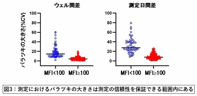 MFI<100の測定値(青)は、100より小さな数値に関する結果なので、ばらつきに幅がありますが、100より大きな数値(赤)については、そのばらつきが20%を下回っていることがわかります。