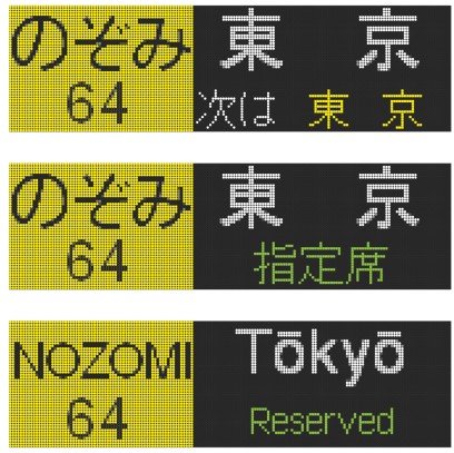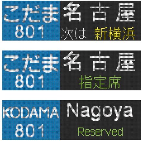 表示は全24種類で、東海道新幹線で見られる「のぞみ・東京」「ひかり・名古屋」などの行先のほか「修学旅行」「回送」「試運転」「団体」といった珍しい表示も含まれています。