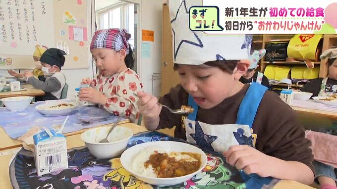 入学式から1週間…。新1年生たちがエプロンと三角巾姿になって給食デビューです。札幌市の小学校では、14日から新1年生の給食がはじまりました。きょうの献立はカレーライスと、小松菜とベーコンのサラダ、それに…