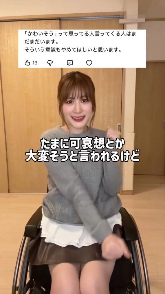 動画の中で猪狩さんは、「たまに可哀想とか大変そうと言われるけど」「『かわいそう』って思っている人言ってくる人はまだまだいます」「そういう意識もやめてほしいと思います」という、SNSに投稿されたコメントを掲示。