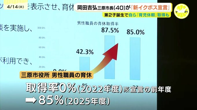 岡田市長による宣言は3年前に続き2回目です。前回の宣言から男性職員の育児休暇の取得率が改善され、0%だった取得率が、2025年度は85%に増えています。