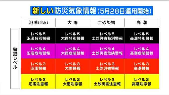現在使われている注意報や警報といった防災気象情報は「複雑でわかりにくい」と指摘されていて、気象庁は情報体系を大幅に見直し5月下旬から運用を始めるとしていました。