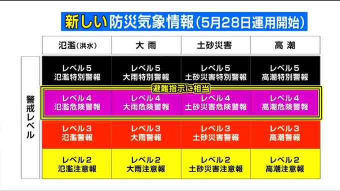 新たな情報体系では、災害の種類が、河川の氾濫、大雨による浸水、土砂災害、そして高潮の4つに分けられ、危険度に応じて相当する「5段階警戒レベル」がつけられます。