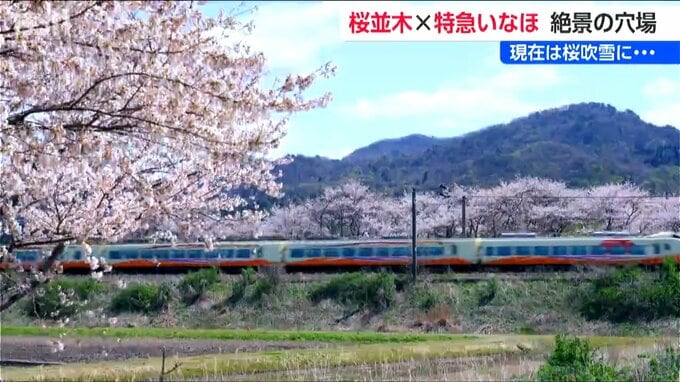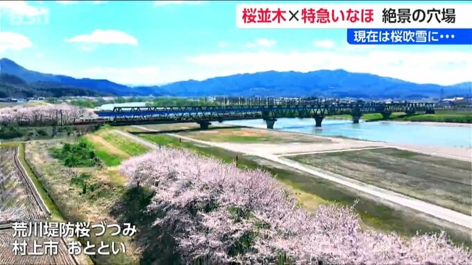 桜は現在散り始めていますが、運が良ければ特急いなほと桜吹雪の美しいコラボレーションに出会えるかもしれません。