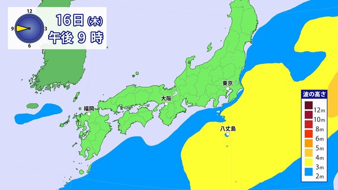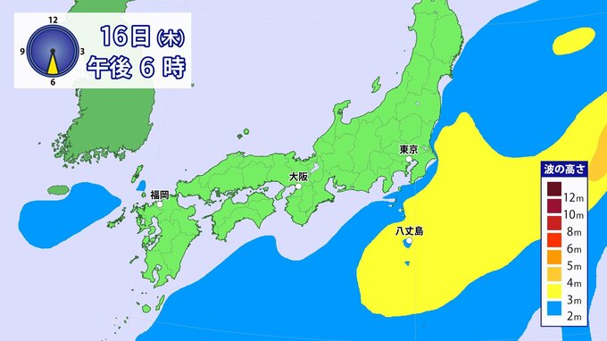 また、16日(木)頃から西日本から東日本の沿岸海上では、台風からのうねりが入る見込みです。