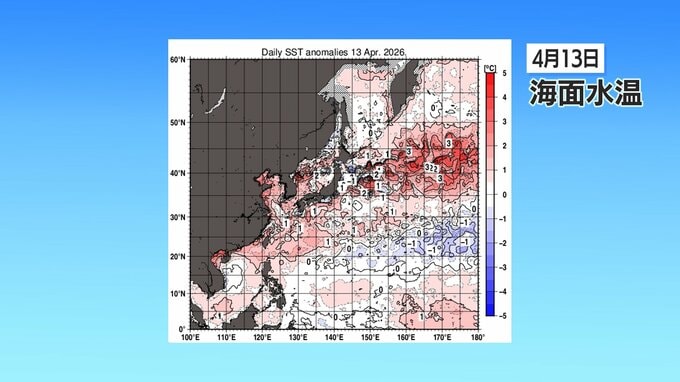 13日の海面水温を見ると、すでに日本のはるか南海上は27℃以上になっており、台風が発達しやすい状態です。