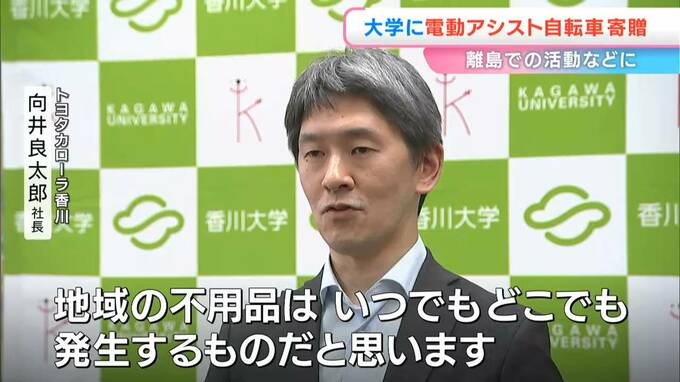 香川大学幸町キャンパスでセレモニーが行われ、電動アシスト自転車2台が贈られました。トヨタカローラ香川のグループ企業が行う不用品回収事業に大学が協力したことがきっかけです。