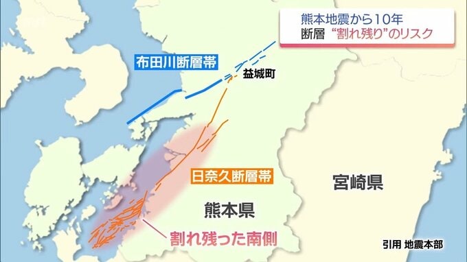2つの断層帯のうち、日奈久断層帯で割れたのは北側のみ。南側は「割れ残り」があると見られています。