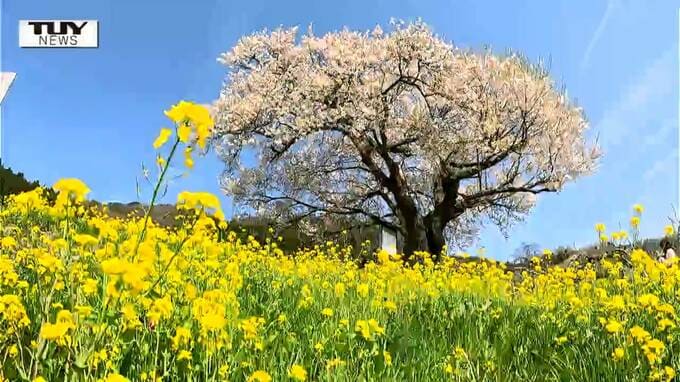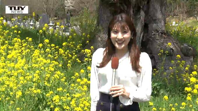 大内希美アナウンサー「青空に力強く伸びる枝には淡いピンク色の桜が咲き誇っています。周りには菜の花の黄色い絨毯が。この時期だけの満開の春を堪能できます」