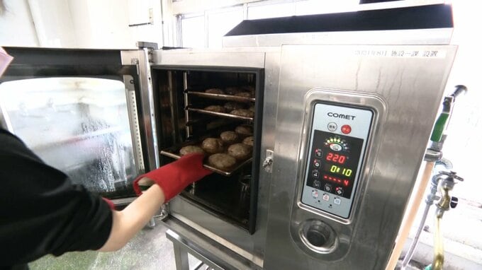 オーブンでじっくり焼き上げたあと特製のデミグラスソースをかけてできあがり。