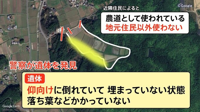 遺体が見つかったのは、国道から130メートルほどの場所で、近隣住民によると「農道として使われていて地元住民以外使わない」ということです。