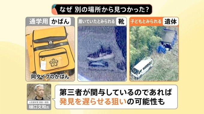 通学用かばんや靴、子どもとみられる遺体はそれぞれ別の場所から見つかっています。樋口さんは「第三者が関与しているのであれば、発見を遅らせる狙いがある可能性も」としています。