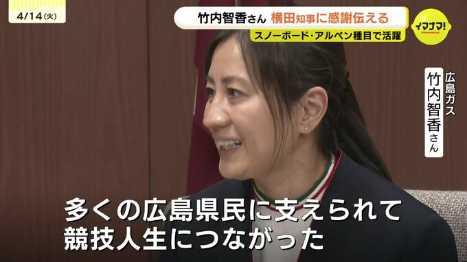 スノーボート・アルペン種目で活躍した竹内智香さんが、これまでの応援への感謝を伝えるため、14日、広島知事のもとを訪れました。