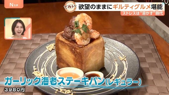 人気メニューは、中をくり抜いた食パンに、エビとニンニク、ステーキをこれでもかと積み上げた「ガーリック海老ステーキパン」。その重さはなんと629g。