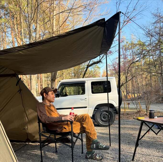 甲本さんは「相棒とオレ」「久しぶりのキャキャキャンプ」とテキスト。1枚目の写真には、かつて投稿していた愛車〝JB64=ジムニー〟のそばにタープを張り、折りたたみのキャンプ用チェアとテーブルを組んだ甲本さんの、悠然と憩う姿が写っています。