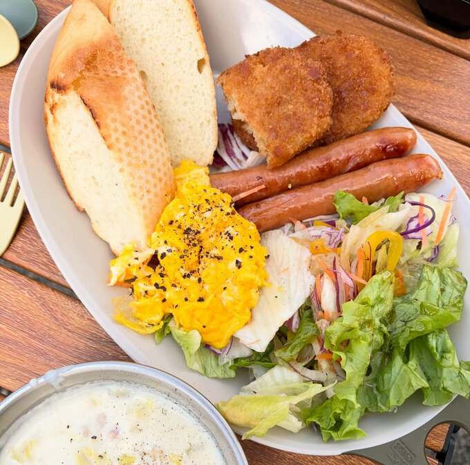 分厚いステーキの夕食や品数の多い朝食の写真を投稿しつつ、甲本さんは「荷物を積み始めると」「バタンバタン音たてて騒ぎはじめるから」と、静かな森の中で音を立ててしまうことを済まながる様子も。