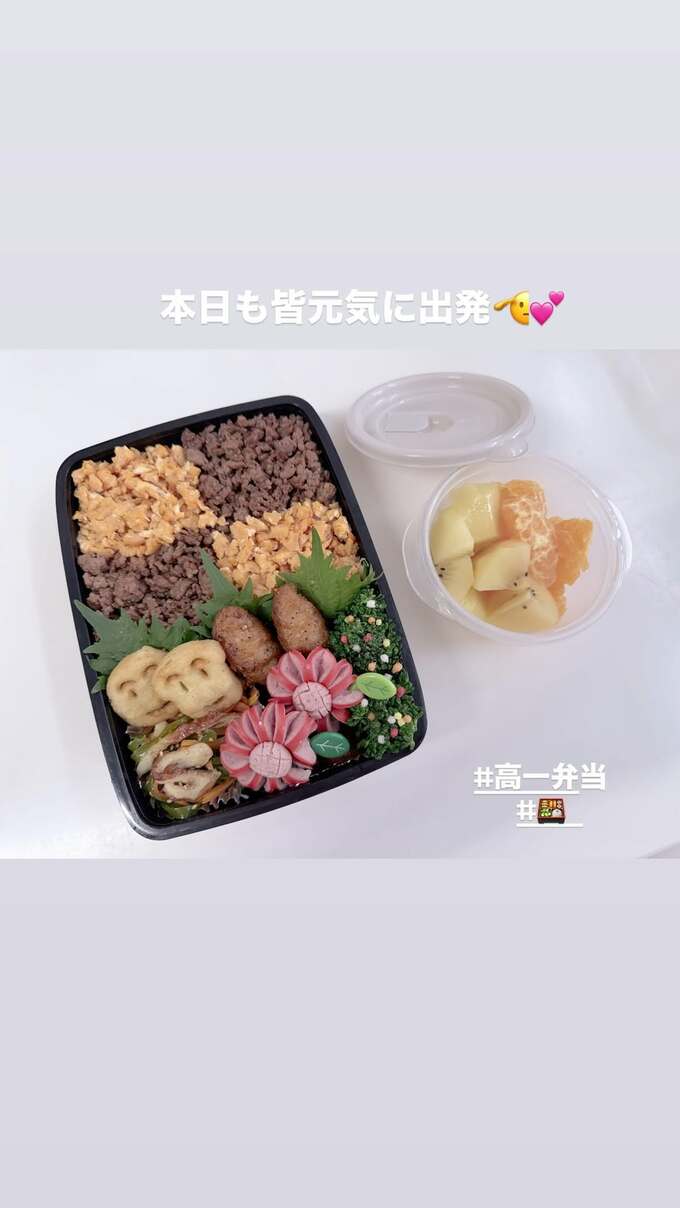 辻さんは「本日も皆元気に出発」と大きく文字を入れた写真を投稿。花の形に切ったウインナー・顔の形をしたポテト・ピーマンとちくわの炒め物・あられを散らしたブロッコリー、そして最も目を惹く、肉と卵の2色のそぼろを互い違いにしたご飯を隙間なくぎっしり詰めたお弁当箱に、デザートとしてキウイフルーツと柑橘を詰めたパックを添えていて、食べ応え満点と思われます。