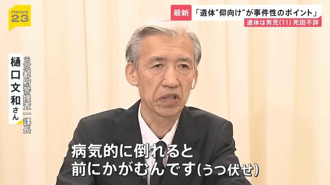 「病気的に倒れると前にかがむんです(うつ伏せ)。ところが(遺体は)仰向けという形で、これが一つの事件性のポイントになろうかと思う。また雨が降っていますので、雨に服が濡れている状況はどの程度かとか、こういったところがポイントになってこようかと思います」