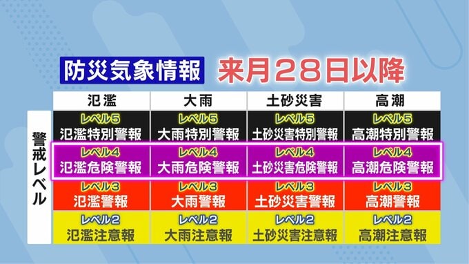 来月5月28日の午後1時から、大雨に関する新しい防災気象情報が運用されます。現在の特別警報と警報の間に、新たにレベル4の「危険警報」ができることになります。これが避難するタイミングとなります。これまで分かりにくいという指摘もあった防災に関する情報を、「氾濫」「大雨」「土砂災害」「高潮」という4つに分類して、それぞれレベル2からレベル5までの4段階で危険度を伝え避難行動に繋げるための変更です。