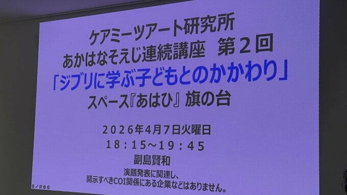 また連続した講座も開催されていて私も4月7日(火)に参加してきました。講師は昭和医科大学教授で院内学級の指導教員も務めている副島賢和教授です。この連続講座ではジブリ作品を通して「自分も相手も大切にするにはどうすればよいのか」という問いについて考えました。