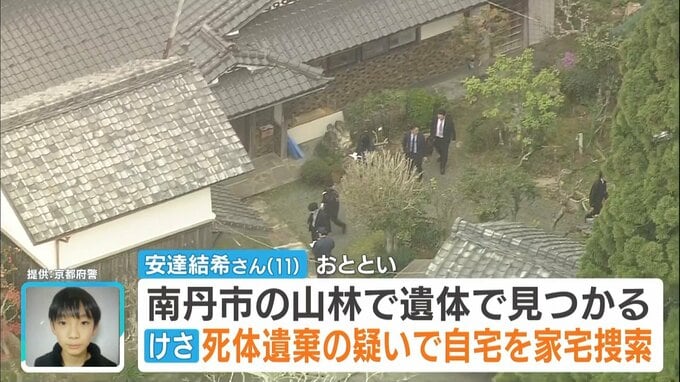 京都府南丹市園部町の11歳の小学生、安達結希さん(11)は13日、南丹市の山林で遺体で見つかりました。警察は死体遺棄の疑いで15日朝から安達さんの自宅に家宅捜索に入りました。