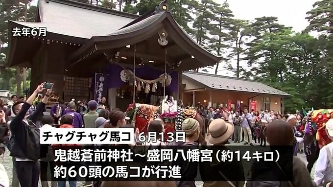 「チャグチャグ馬コ」保存会によりますと、2026年は6月13日に、岩手県滝沢市の鬼越蒼前神社から盛岡八幡宮まで14kmほどの道のりを、およそ60頭の馬コが行進します。