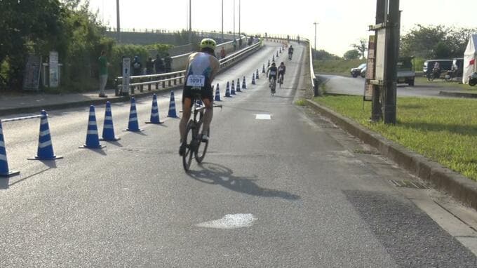 1.5キロを泳いだ後のバイクは40キロのコースで、参加者は市街地を抜けて島をほぼ半周して再び市街地に戻ります。